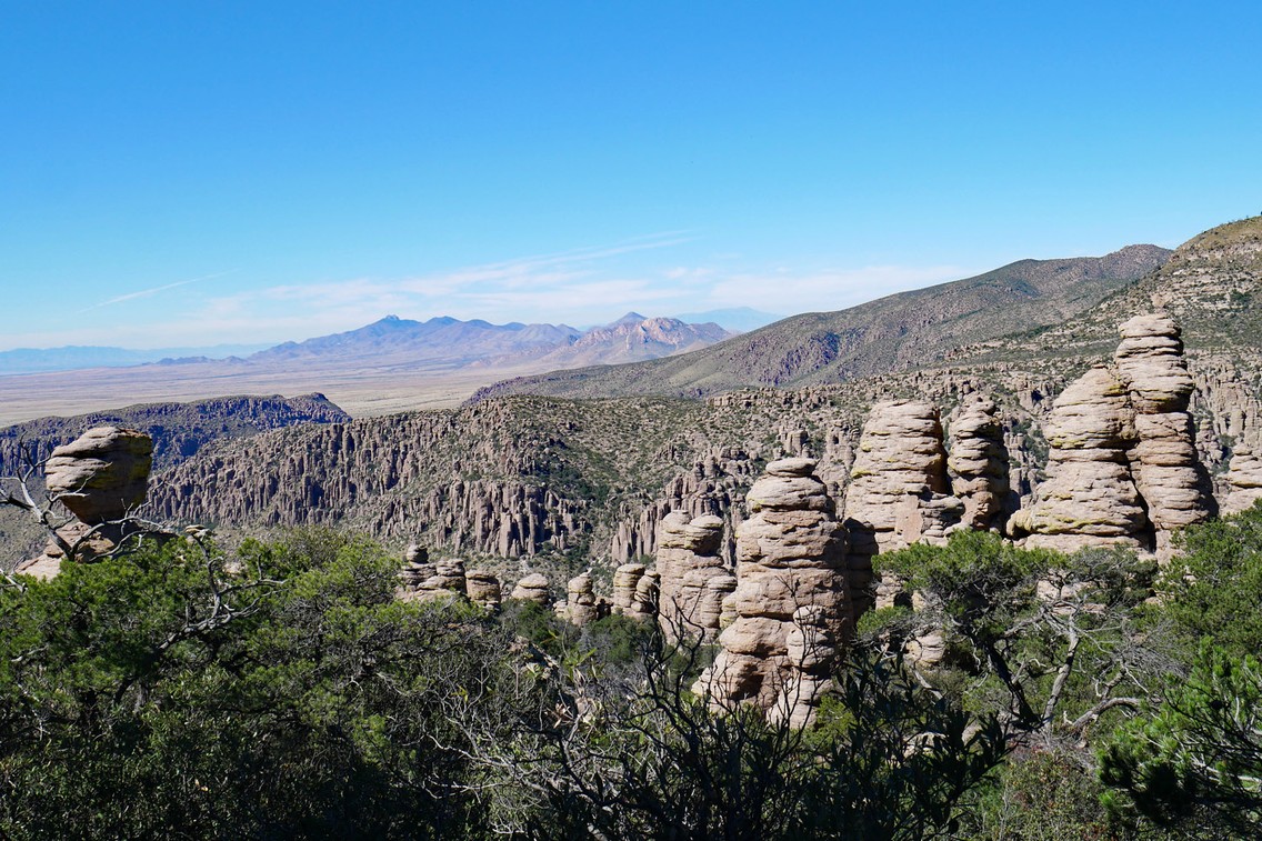 Die von Geronimo angeführten Chiricahua-Apachen nannten die gigantische 2.978 m hohe Gebirgsinsel über der Chihuahua-Wüste „Land der auferstandenen Felsen“. Wie eine Armee aus segmentierten Totempfählen wachen die balancierenden Säulen- und Sockelskulpturen aus grau-braunem Rhyolith über den von Bachläufen gespeisten Auen und Schluchten. Es gibt über 100 Vogelarten wie den Eichelspecht und den lustigen blaugeflügelten Mexican Jay (Graubrusthäher). Ein Weißwedelhirsch oder Nasenbär lässt sich gerne mal blicken, ein Schwarzbär ist Glücksache. Der hübschen wie Zorro um die Augen maskierten Schwarzschwanz-Klapperschlange will man eher nicht begegnen. Doch ist gerade diese sehr scheu und weit weniger toxisch als andere Grubenottern.