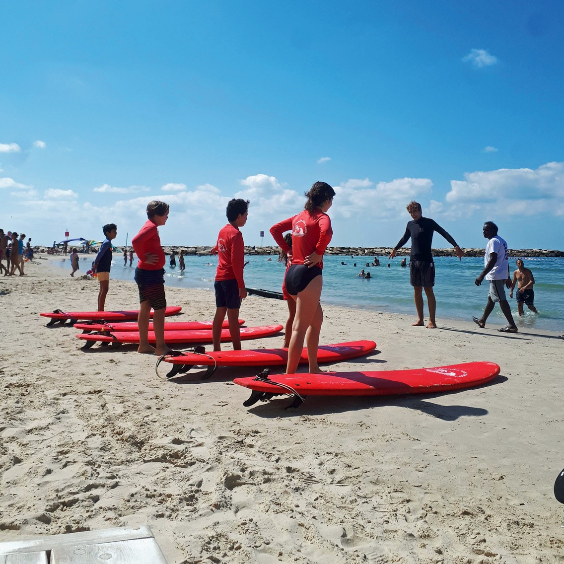 Avi erklärt, wie wir uns auf das Brett legen müssen, wir üben ein paar Sprünge auf dem Trockenen, und los geht es. Ich klette mir das Brett an der langen Leine an mein Bein, nehme es unter den Arm und laufe hinter Avi ins Wasser. Kein bisschen kalt in der Ganzkörperpelle. Wir gehen dorthin, wo die Wellen bereits gebrochen sind. Blutige Anfänger eben. Weiter draußen donnern die Wogen für die Könner. »Your turn«, ruft mein Lehrer gegen das Meeresrauschen an. Ich paddle mit den Händen in seine Richtung. Dann stellt er sich hinter mich und bläut mir ein: »Denk dran, dass du erst aufstehst, wenn du den Zug von den Wellen spürst.« Auf den Wellen ritt man in Israel schon in den späten 50er-Jahren. Damals war es nur eine kleine Gruppe von Jungs, die sich die Haare lang wachsen ließen und einen auf nahöstliche Beach Boys machten. Heute ist Surfen so etwas wie ein Nationalsport. An den Stränden von Haifa bis nach Aschkelon gibt es Dutzende Clubs. Und auch in Gaza wird gesurft. Morgens früh, wenn die Gischt spritzt und der Wind noch nicht zu stark ist, sind oft Hunderte von Surferinnen und Surfer im Wasser. Noch ein paar Miniwellen platschen unter meinem Bauch vorüber, dann schreit Avi plötzlich »go« und gibt mir einen Stoß.