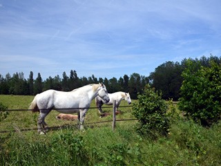 Auf die Frage, ob die Pferde auf der Weide hinter dem Swimmingpool Percherons seien, schüttelt Pietro mit dem Kopf: »Nein, dies sind ein Trotter und ein Selle Français.« Percherons sind anscheinend weniger häufig anzutreffen als erhofft. Wer in der Hoffnung ein paar Percherons zu sehen, bei Ausflügen immer wieder den Blick auf die Weiden links und rechts des Weges wirft, wird in der Regel nicht so leicht fündig. Die wuchtigen Kaltblutpferde – in der überwiegenden Zahl Rappschimmel – waren einst vor allem als Arbeitspferde beliebt. Bei einem Gewicht von rund 900 Kilogramm konnten sie Pflüge oder Kutschen durch unbefestigtes Gelände ziehen. Da Percherons, die man wegen ihrer Körpermasse auch zur Fleischproduktion gezüchtet hat, sehr wendig sind und sich gut zum Reiten eignen, nehmen Spezialisten an, dass es sich bei dieser Rasse um Nachfahren jener Pferde handelt, die einst auch Ritter mit ihrer schweren Rüstung tragen konnten.